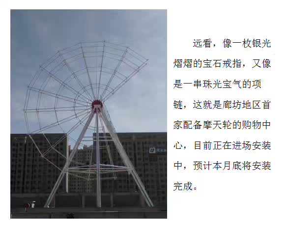在胜芳首家摩天轮安装完成后,您将可以在这里感受到幸福,和爱的人一起坐上摩天轮,在装满爱的格子里一起跨越天空。