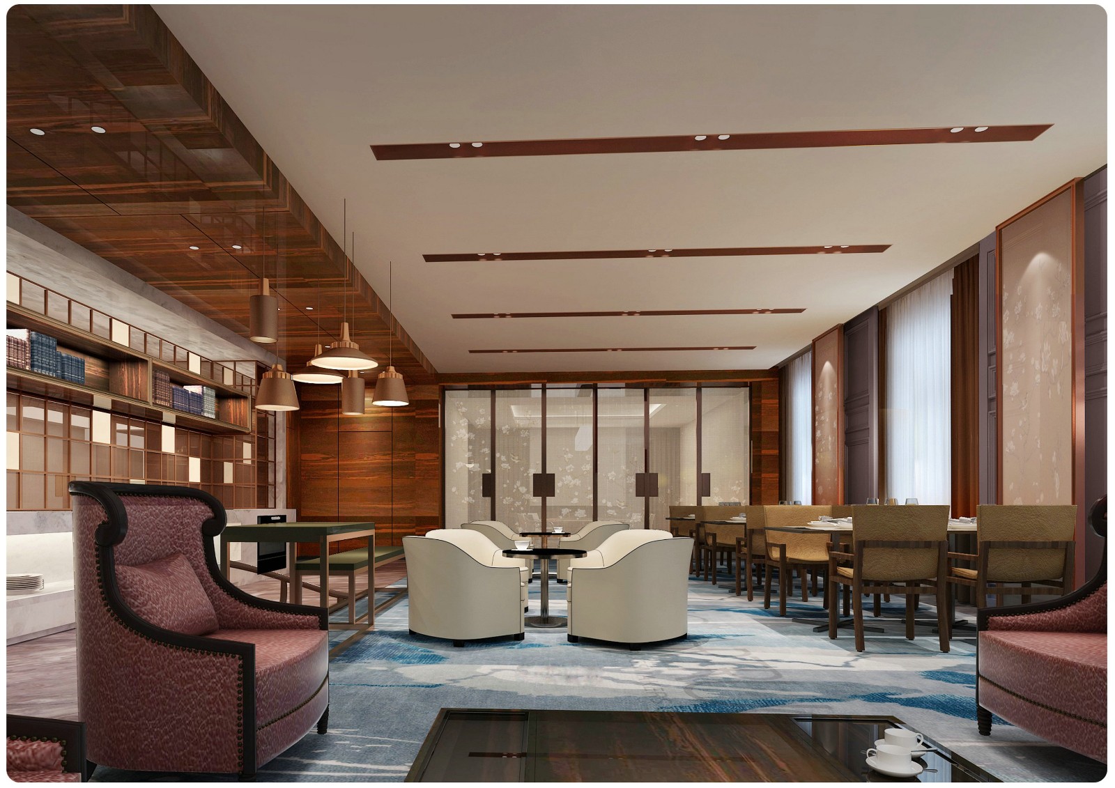 独具特色的中、西餐厅及宴会厅可同时容纳400余人用餐,并配备8间豪华包间。宴会厅融合中国传统古典雅致风格和现代简洁的设计和布局,彰显尊贵品质及中国古典魅力,并特聘名厨主理,美食让您大块朵颐。